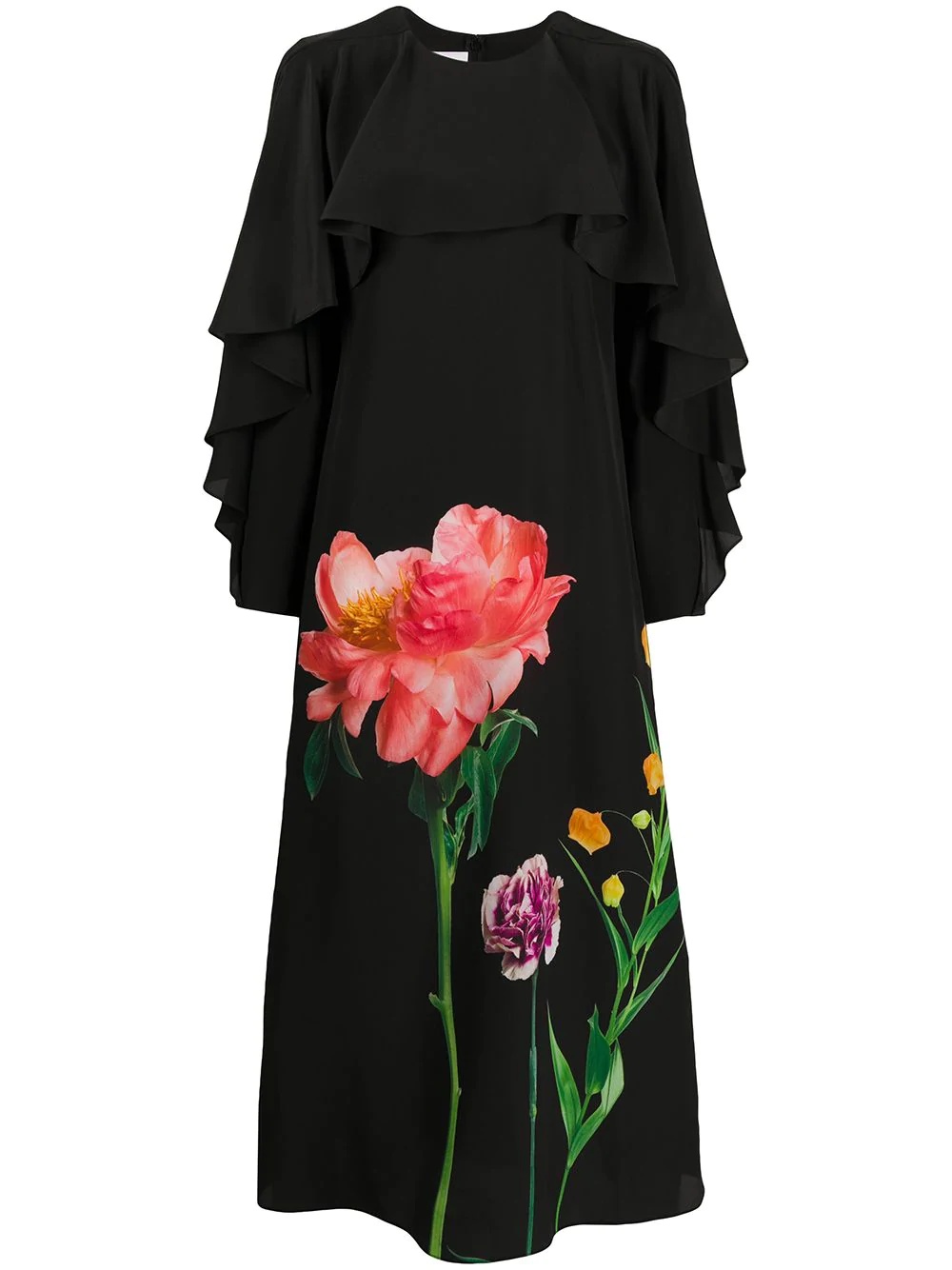 floral print detail midi dress If you're all about talking the part but also dressing the part, this Valentino Garavani dress is meant for you. Boasting floral print details and fluid construction, as soon as you walk into whatever room you're meant to people will know you mean business. Great choice. Highlights - Valentino ready to wear - Black/multicolour - Silk - Floral print details - Ruffled detailing - Round neck - Long sleeves - Rear zip fastening - Straight hem Made in Italy Composition Silk 100% SIZE & FIT FittingInformation This piece fits true to size. We recommend you get your regular size Cut for a loose fit Made with a lightweight non-stretch fabric Washing instructions Read Manufacturer Guidelines