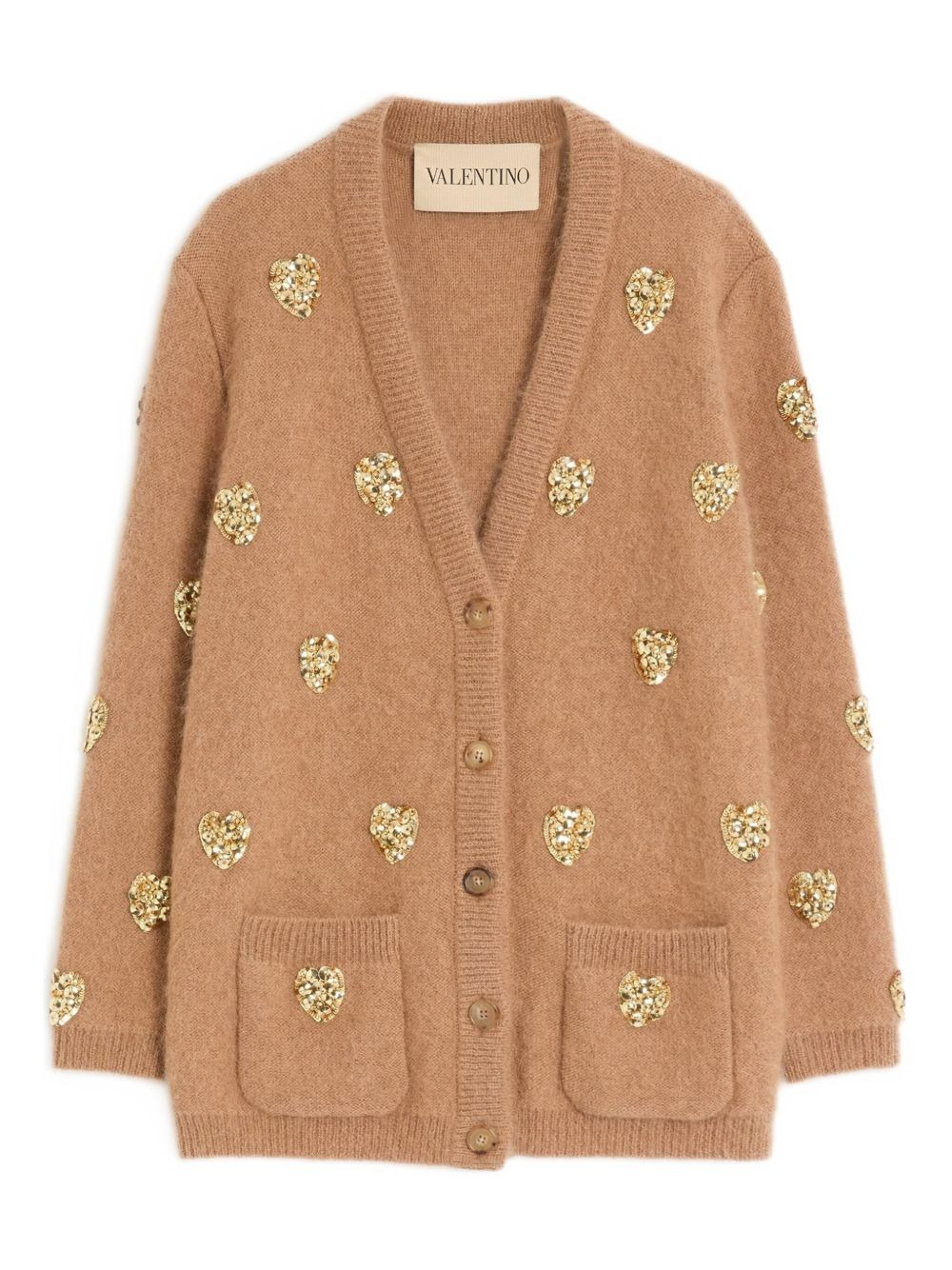 heart-embellished cardigan Highlights - Camel beige - Heart embellishments - Front button closure - Front patch pockets - V-neck - Long sleeves Made in Italy Composition Mohair 49%, Wool 31%, Polyamide 20% Washing instructions Read Manufacturer Guidelines