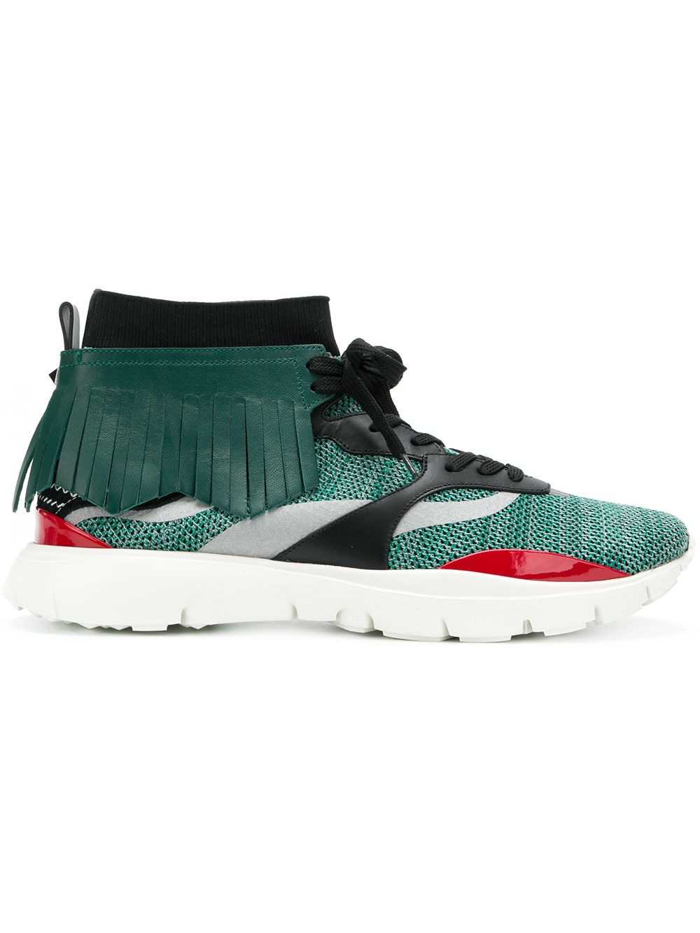 Heroes embroidered sneakers Valentino Garavani is known for it's edgy yet elegant aesthetic, both in its formal and casualwear. These deep emerald and black Heroes embroidered sneakers are crafted from leather and suede and feature a round toe, a lace-up front fastening, a pull tab at the rear, an ankle length and a lightweight rubber sole. Made in Italy Composition Outer: Calf Leather 100%, Suede 100%, Polyester 100% Lining: Polyamide 100% Sole: Rubber 100%