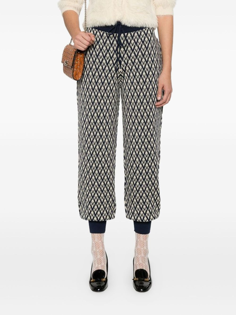 Toute La V jacquard track pants Highlights - Blue and white - Toute la v jacquard - Virgin wool - Drawstring waist - Ribbed trim Made in Italy Composition Virgin Wool 100% SIZE & FIT FittingInformation Designed for a relaxed tapered cut, these trousers allow for a close fit at the waist and offer a loose fit at the thighs, with a closer fit toward the ankles Adjust this piece’s waistband to your preference using the drawstring Made with a midweight knit, this piece offers some stretch