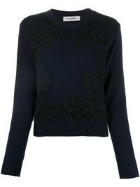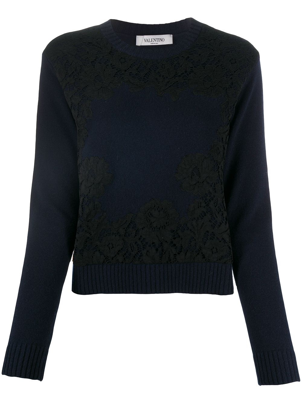 lace overlay jumper Who knew a knit could look this good. Valentino Garavani knew when they designed this lace overlay jumper spun from navy wool-cashmere blend. Just because it's cold outside, doesn't mean your style should take a hit. Highlights - Valentino ready to wear - Navy blue - Wool-cashmere blend - Floral-lace detailing - Ribbed-knit edge - Crew neck - Long sleeves - Straight hem Made in Italy Composition Virgin Wool 70%, Viscose 43%, Cotton 34%, Cashmere 30%, Polyamide 23% SIZE & FIT Model measurements Height 5 ft 11 in(1.8 m) Bust/Chest 33.07 in(84 cm) Hips 37.4 in(95 cm) Waist 25.19 in(64 cm) FittingInformation This piece fits true to size. We recommend you get your regular size Cut for a relaxed fit Made with a mid-weight fabric Washing instructions Read Manufacturer Guidelines