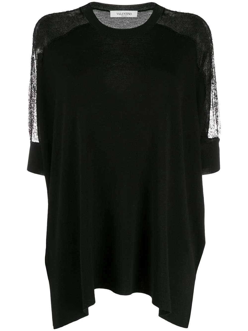 lace panel detail knitted top Valentino Garavani won't let you down with this one. Made from virgin wool and boasting lace panels to the shoulders, this piece is that must-have thing one needs in a closet. Can't argue with that. Highlights - Valentino ready to wear - Black - Virgin wool - Lace panelling - Knitted construction - Round neck - Short sleeves - High-low hem Made in Italy Composition Polyester 100%, Viscose 100%, Virgin Wool 100% SIZE & FIT Model measurements Height 5 ft 10 in(1.78 m) Bust/Chest 31.49 in(80 cm) Hips 36.22 in(92 cm) Waist 25.59 in(65 cm) FittingInformation This piece fits true to size. We recommend you get your regular size Cut for a loose fit Made with a mid-weight fabric Washing instructions Dry Clean Only