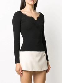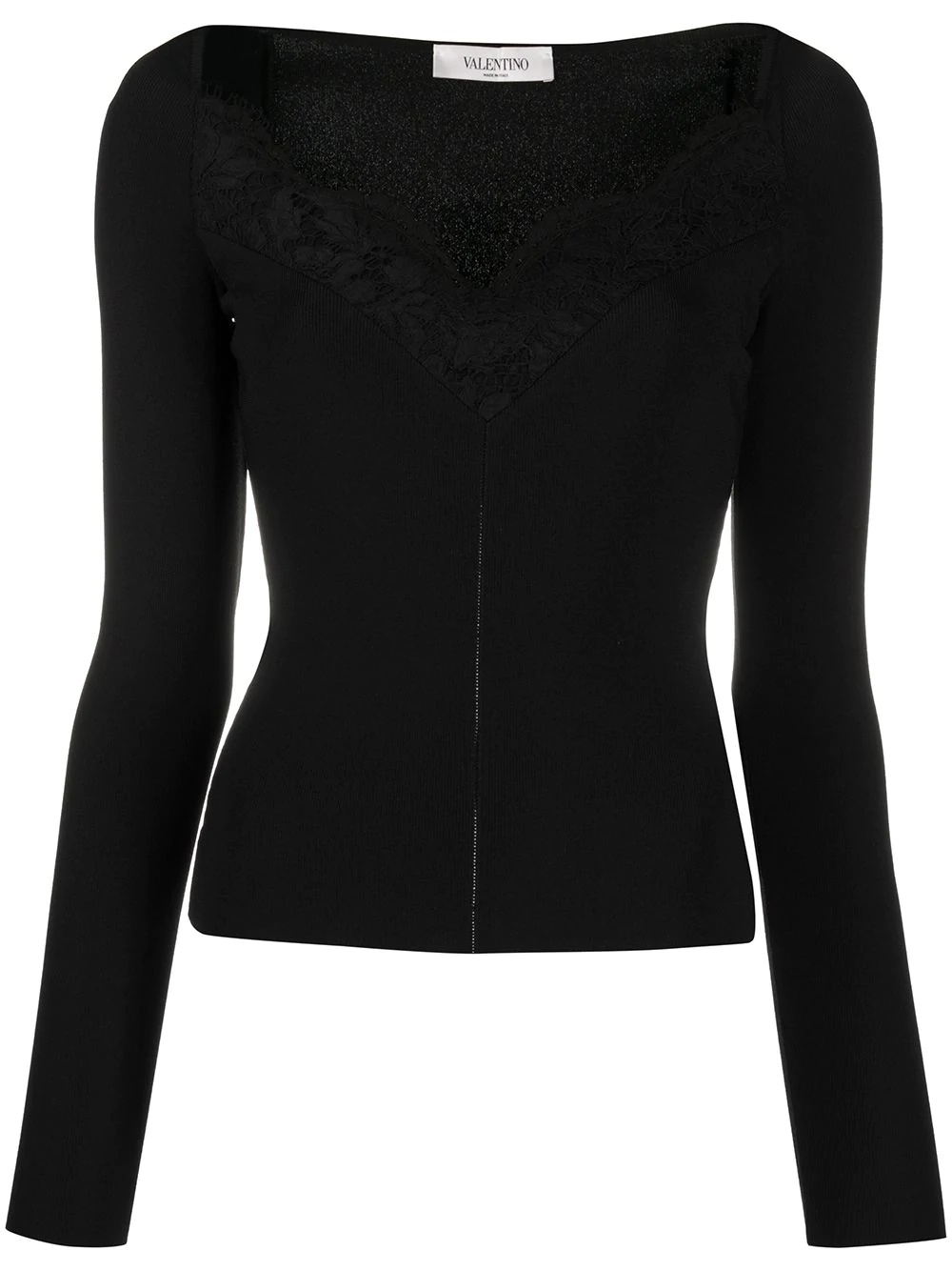 lace-trim fitted jumper There's always space for more lace in your closet. This black fitted jumper from Valentino Garavani is trimmed with floral lace adding a feminine touch to your looks. Life is too short to wear dull clothes! Highlights - Valentino ready to wear - Black - Floral-lace detailing - Scalloped edge - Long sleeves - Straight hem Made in Italy Composition Viscose 75%, Polyester 25% SIZE & FIT Model measurements Height 5 ft 11 in(1.8 m) Bust/Chest 33.07 in(84 cm) Hips 37.4 in(95 cm) Waist 25.19 in(64 cm) Measurement SLEEVE LENGTH 19.68 in(50 cm) Shoulder Width 8.66 in(22 cm) LENGTH 20.47 in(52 cm) WAIST 21.65 in(55 cm) BUST 26.37 in(67 cm) FittingInformation This piece fits true to size. We recommend you get your regular size Cut for a close fit Made with a mid-weight fabric Washing instructions Dry Clean Only