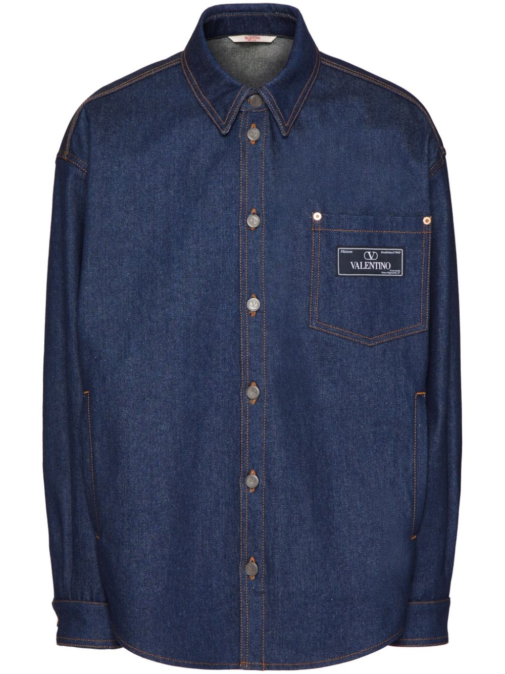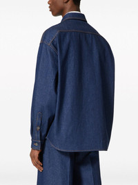 logo-applique denim shirt Contrasting Valentino Garavani's classic style, this denim shirt is crafted from cotton to a relaxed, contemporary style. Decorated with a logo patch at the chest, the long-sleeved design is complete with a chest patch pocket. Highlights - Indigo blue - Cotton - Denim - Maison valentino tailoring applique - Contrast stitching - Pointed flat collar - Front button placket - Drop shoulder - Long sleeves - Buttoned cuffs - Curved hem - Valentino ready to wear - The full look includes valentino garavani accessories. Made in Italy Composition Cotton 100% Lining: Polyester 65%, Cotton 35% SIZE & FIT Measurement CHEST 52 in(132.1 cm) SLEEVE LENGTH 22 in(55.9 cm) WAIST 50 in(127 cm) Washing instructions Read Manufacturer Guidelines