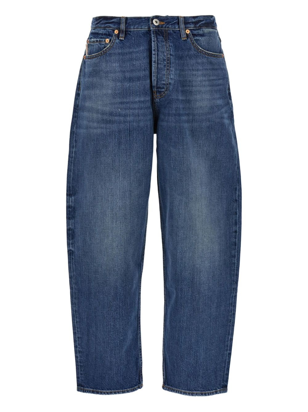 logo-patch loose-fit jeans Highlights - Blue - Cotton/leather - Denim - Front button fastening - Classic five pockets - Belt loops - Whiskering effect at the thighs - Logo patch to the rear Made in Italy Composition Outer: Cotton 100%, Calf Leather 100% Lining: Polyester 65%, Cotton 35%