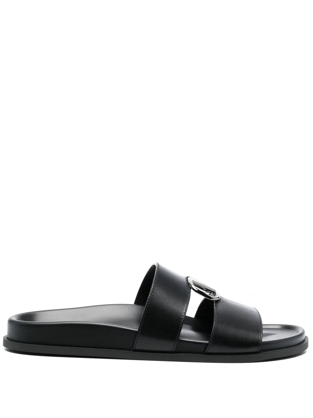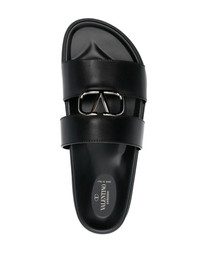 logo-plaque calf leather sandals Valentino Garavani's iconic VLogo has remained a mainstay for the house since it first debuted in 1968 at the Sala Bianca show. Here the signature accents these sandals for a branded focus. Highlights - Black - Calf leather - Signature v logo plaque - Double-strap design - Moulded footbed - Open toe - Slip-on style Made in Italy Composition Outer: Calf Leather 100% Lining: Calf Leather 100% Sole: Plastic 100% SIZE & FIT Measurement HEEL 0.98 in(2.5 cm) Sole height 0.59 in(1.5 cm) Washing instructions Read Manufacturer Guidelines
