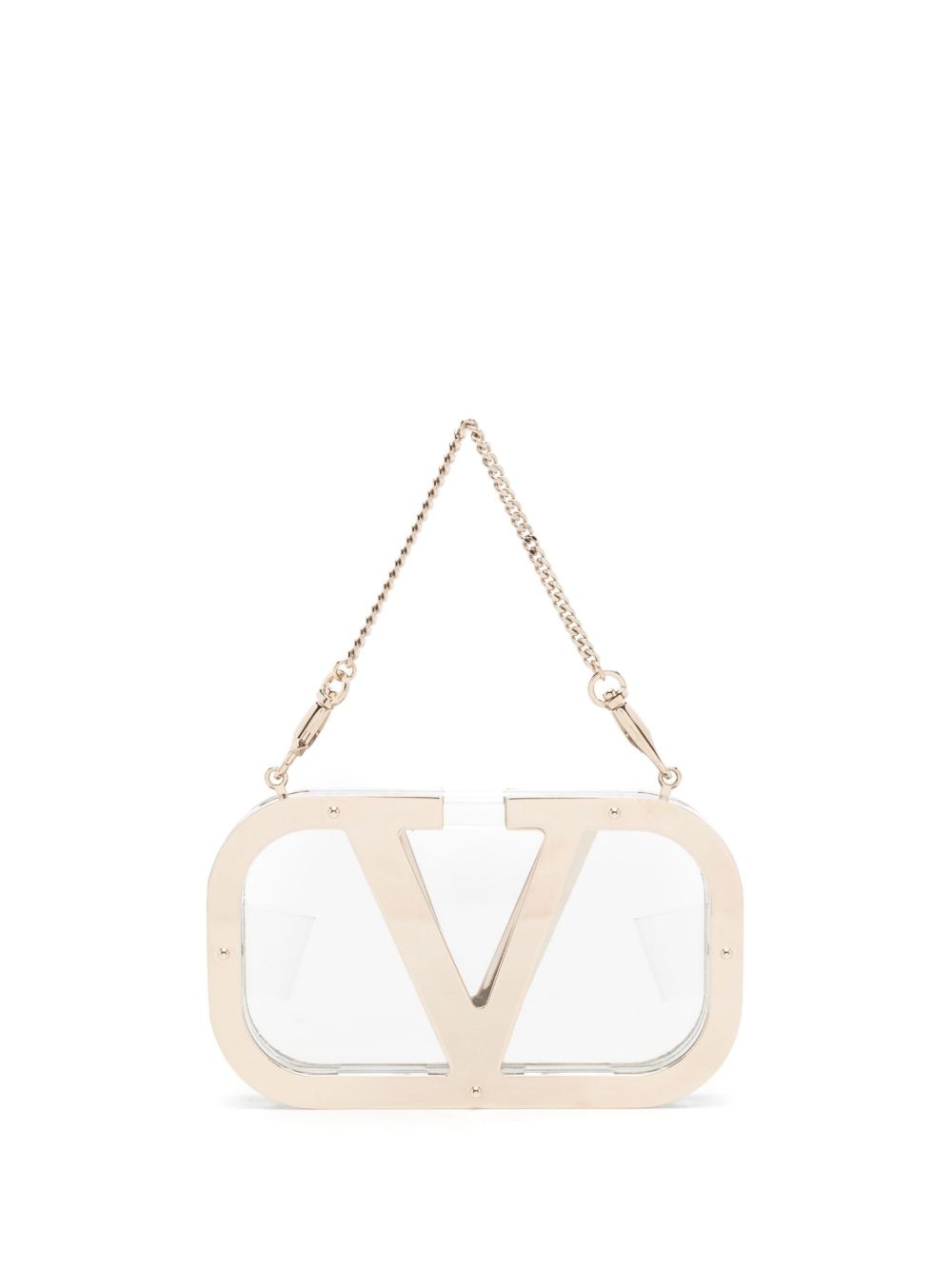 logo-plaque clear clutch Highlights - Gold-tone - Transparent design - Maxi vlogo signature - Detachable chain-link top handle - Magnetic fastening - Main compartment Made in Italy Composition Body: Metal 50% Plastic 50% SIZE & FIT Model measurements Height 5 ft 9 in(1.76 m) Bust/Chest 30.31 in(77 cm) Hips 35.03 in(89 cm) Waist 23.62 in(60 cm)