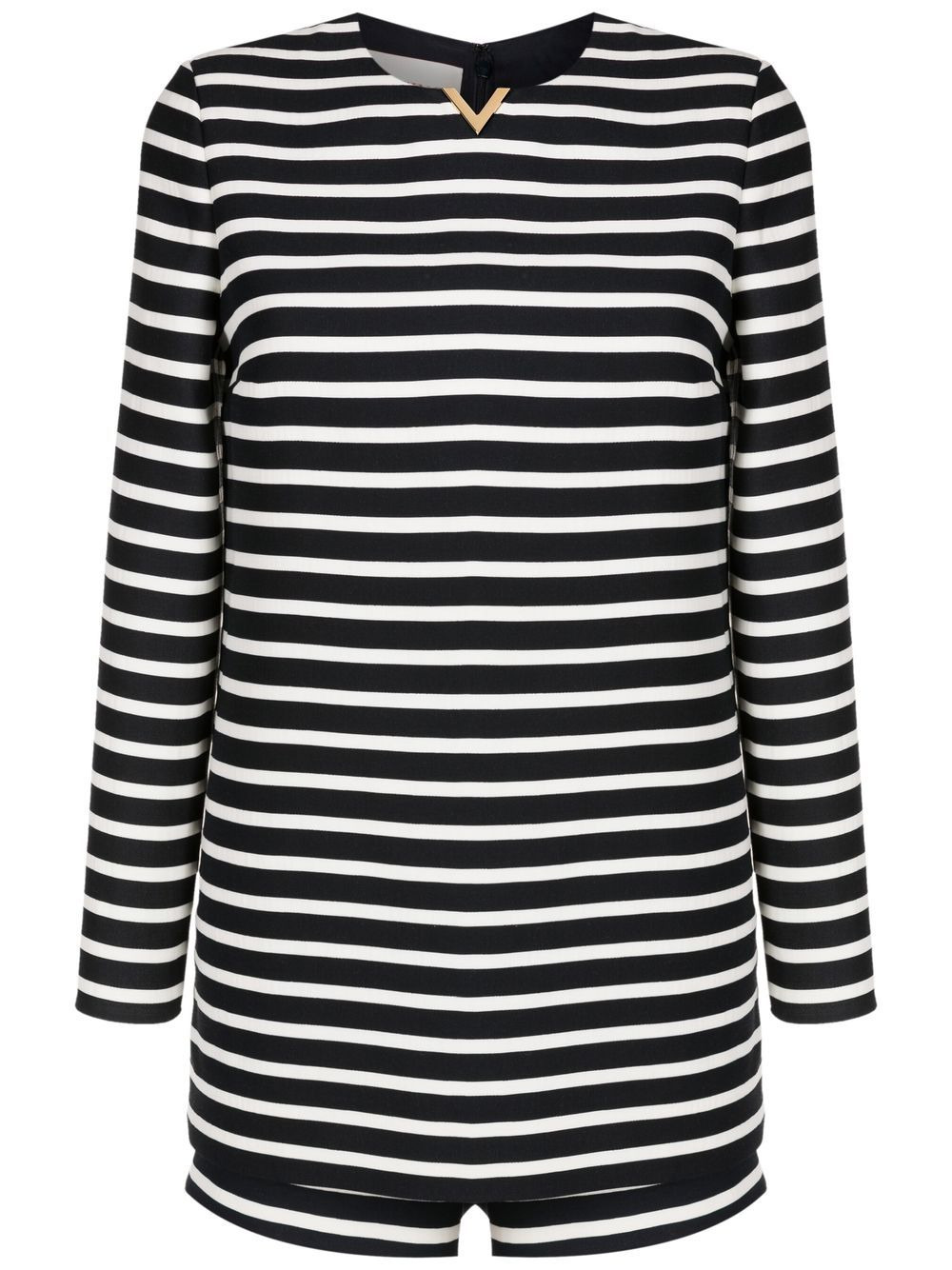 logo-plaque stripe-print playsuit Highlights - Valentino ready to wear - Black/white - Virgin wool blend - Horizontal stripe print - Gold-tone logo plaque - Concealed rear zip fastening - Long sleeves - Thigh-high Made in Italy Composition Virgin Wool 65%, Viscose 35% SIZE & FIT Model measurements Height 5 ft 10 in(1.77 m) Bust/Chest 32.28 in(82 cm) Hips 36.61 in(93 cm) Waist 25.19 in(64 cm) FittingInformation This piece fits true to size. We recommend you get your regular size Cut for a slim fit Made with a mid-weight non-stretch fabric