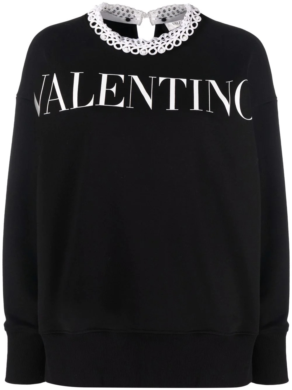 logo-print long-sleeve sweatshirt Valentino Garavani pairs streetwear-inspired style with the brand's sense of opulence in this long-sleeve sweatshirt design. Featuring the brand's logo printed across the front which ties in with current branding trends, its detachable lace collar adds a sophisticated edge to the casual wear piece. Highlights - Valentino ready to wear - Black - Cotton - Logo print to the front - Round neck - Detachable collar - Drop shoulder - Long sleeves - Straight hem - Keyhole detail to the rear Made in Italy Composition Cotton 100%, Polyester 100% SIZE & FIT Model measurements Height 5 ft 9 in(1.75 m) Bust/Chest 32.67 in(83 cm) Hips 36.22 in(92 cm) Waist 24.8 in(63 cm) FittingInformation This piece fits true to size. We recommend you get your regular size Cut for a loose fit Made with a mid-weight stretch fabric