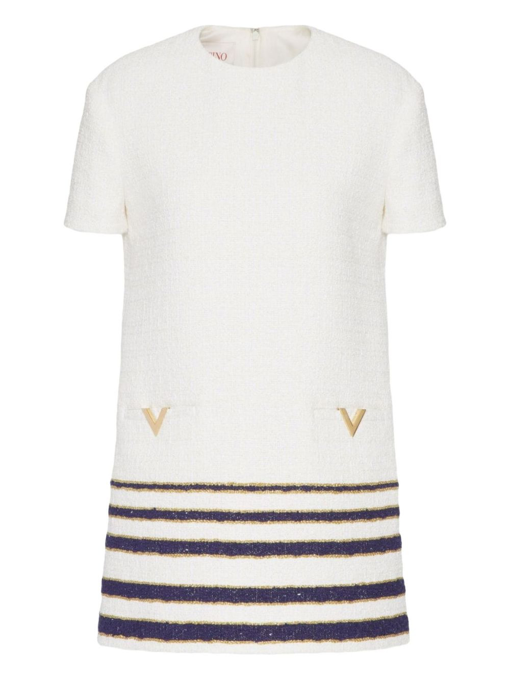 Mariniere tweed minidress Valentino Garavani’s minidress evokes nautical inspiration. Crafted from cotton-blend tweed to a classic shift silhouette, it’s striped with contrasting navy lines and finished with a gold-tone VLogo at each patch pocket. Highlights - Valentino ready to wear - Ivory white/navy blue/gold-tone - Cotton blend - Tweed - Shift style - Horizontal stripe print - Gold-tone logo plaque - Round neck - Concealed rear zip fastening - Short sleeves - Two front patch pockets - Straight hem - Thigh-length - Logo-embellished lining - The full look includes valentino garavani accessories. Made in Italy Composition Outer: Viscose 47%, Cotton 43%, Polyamide 9%, Metallic Fibre 1% Lining: Cupro 100% SIZE & FIT Measurement HIPS 42.51 in(108 cm) LENGTH 35.43 in(90 cm) WAIST 38.58 in(98 cm) Washing instructions Read Manufacturer Guidelines