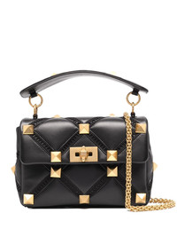 medium Roman Stud shoulder bag Introduced in 2020, Valentino Garavani's Roman Stud is an enlarged version of the brand's iconic Rockstud embellishment. Seen adorning this leather shoulder bag, the gold-tone hardware punctuates the padded exterior. Highlights - Black - Leather - Single flat top handle - Chain-link shoulder strap - Foldover top - Twist-lock closure - Main compartment - Internal zip pocket - Internal logo patch - Quilted - Signature roman stud detailing Made in Italy Composition Lining: Lamb Skin 100% Outer: Lamb Skin 100%, Metal 100% SIZE & FIT Measurement DEPTH 3.93 in(10 cm) HEIGHT 6.29 in(16 cm) WIDTH 9.84 in(25 cm)