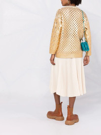 metallic-effect V-neck cardigan Valentino Garavani really knows how to vamp up classic pieces. Constructed from virgin wool, this V-neck cardigan features a classic knitted silhouette with its long sleeves and is elevated by its striking gold-tone metallic effect. Highlights - Valentino ready to wear - Gold-tone - Virgin wool - V-neck - Front button fastening - Long sleeves - Ribbed cuffs - Ribbed hem - Two front patch pockets - Metallic effect Made in Italy Composition Virgin Wool 100%, Viscose 81%, Metallic Fibre 19% SIZE & FIT Model measurements Height 5 ft 11 in(1.8 m) Bust/Chest 31.49 in(80 cm) Hips 35.82 in(91 cm) Waist 24.8 in(63 cm) Measurement SLEEVE LENGTH 20.07 in(51 cm) LENGTH 27.55 in(70 cm) FittingInformation This piece fits true to size. We recommend you get your regular size Cut for a loose fit Made with a mid-weight fabric Washing instructions Hand Wash