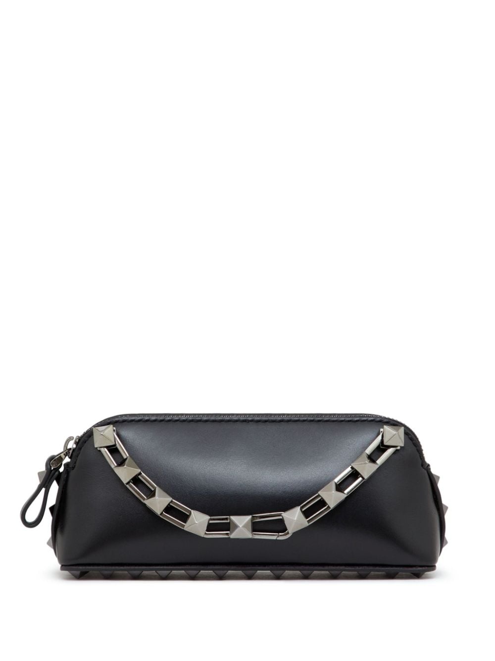 mini Rockstud clutch bag Crafted from smooth black lambskin leather, this triangular mini bag from Valentino Garavani has been adorned with the brand's signature Rockstud embellishments and a sleek silver-tone chain. Highlights - Black tie collection - Black - Lambskin - Signature rockstud detailing - Chain-link detailing - Top zip fastening - Detachable shoulder strap - Main compartment Made in Italy Composition Outer: Calf Leather 100%, Metal 100% Lining: Lambskin 100% SIZE & FIT Measurement WIDTH 6.69 in(17 cm) HEIGHT 2.75 in(7 cm) DEPTH 1.96 in(5 cm) Washing instructions Read Manufacturer Guidelines