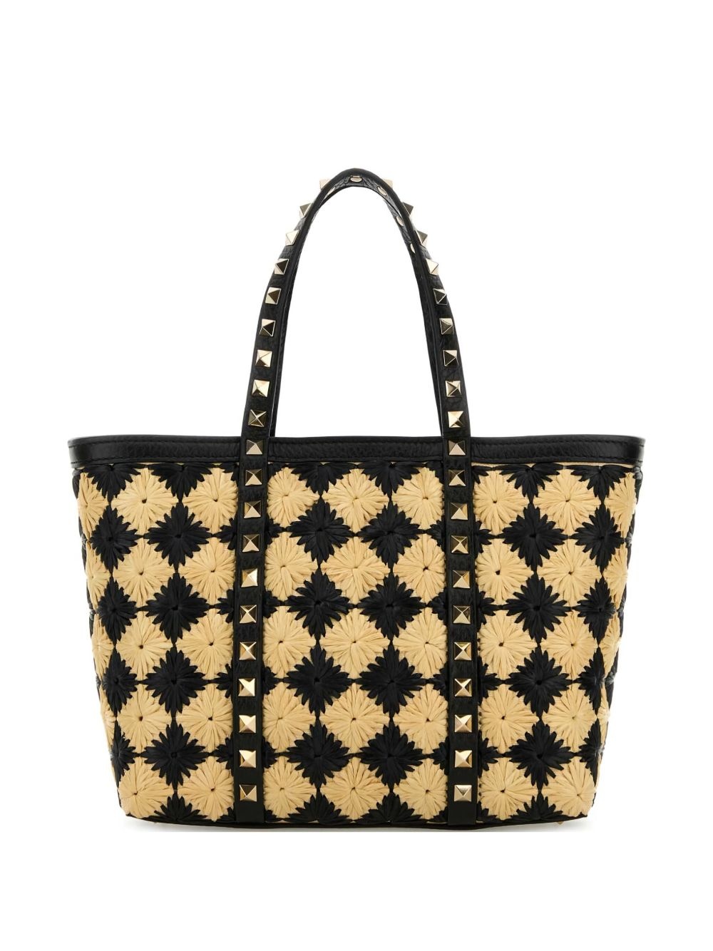 mini Rockstud tote bag Highlights - Black - Concealed magnetic fastening - Two flat top handles - Main compartment - Embroidered design Made in Italy Composition Outer: Raffia 100% SIZE & FIT Measurement DEPTH 3.14 in(8 cm) HEIGHT 6.88 in(17.5 cm) STRAP 4.52 in(11.5 cm) WIDTH 7.87 in(20 cm)