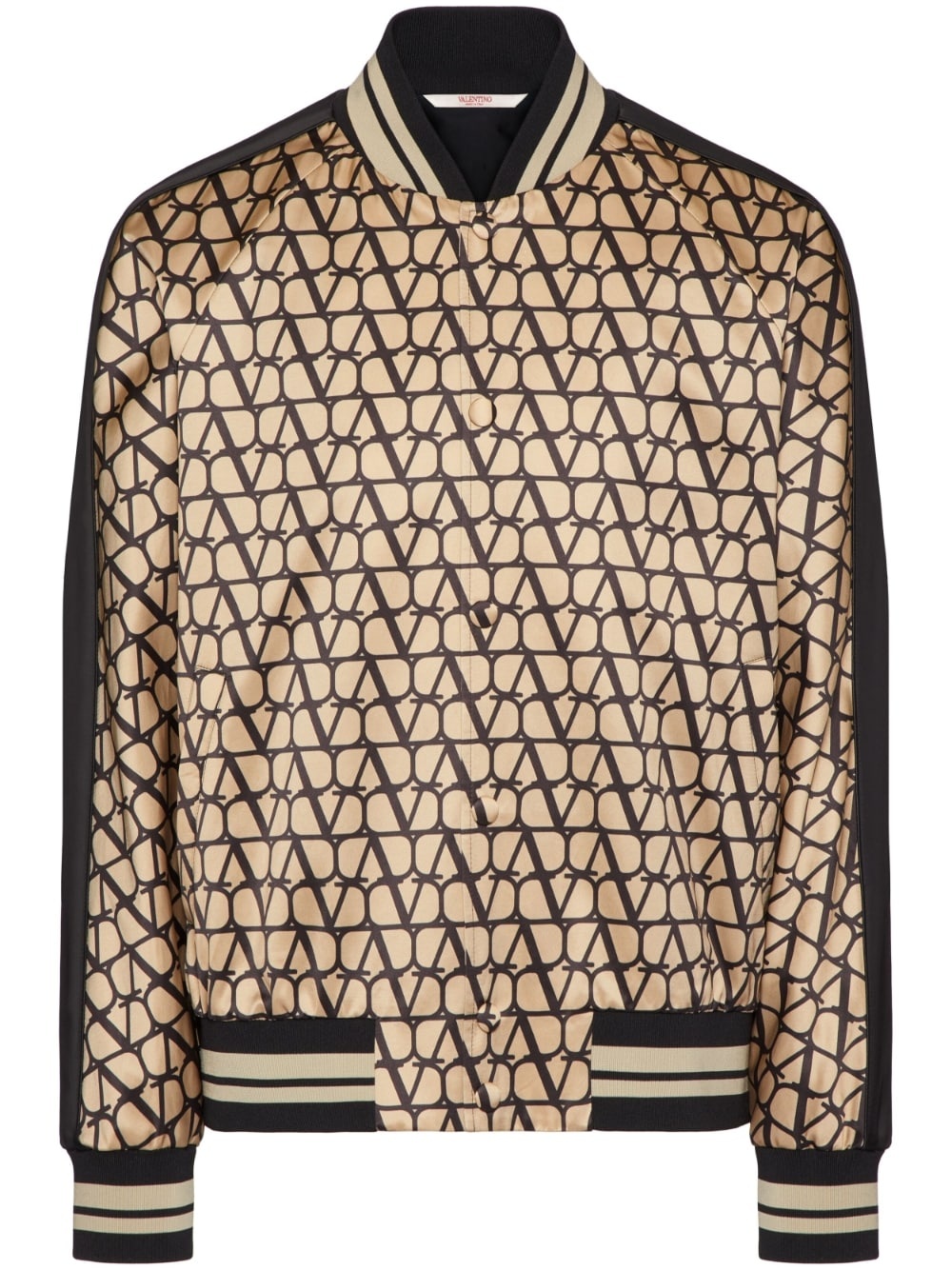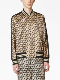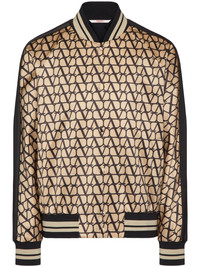 Toile Iconographe bomber jacket This jacket by Valentino Garavani spotlights the brand's iconic monogram pattern. First introduced in 1968, the now reframed V-logo stamps this satin-finish jacket, echoing the brand's penchant for creating statement designs. Highlights - Valentino ready to wear - Beige/black - Satin finish - Monogram pattern - Baseball collar - Front button fastening - Long sleeves - Stripe detailing - Ribbed cuffs and hem - Striped border - The full look includes valentino garavani accessories. Made in Italy Composition Outer: Polyester 81%, Viscose 63%, Cotton 37%, Polyamide 16%, Elastane 3% Lining: Cupro 100% SIZE & FIT Measurement CHEST 40.98 in(104.1 cm) SLEEVE LENGTH 25 in(63.5 cm) Shoulder Width 15.98 in(40.6 cm) LENGTH 23.5 in(59.7 cm) WAIST 35.98 in(91.4 cm) Washing instructions Read Manufacturer Guidelines