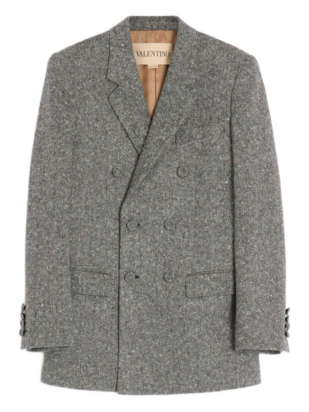 natte-boutonne double-breasted blazer Highlights - Valentino ready to wear - Grey - Double-breasted fastening - Peaked lapels - Flap pockets - Buttoned cuffs Made in Italy Composition Outer: Wool 85%, Polyamide 15% Lining: Cupro 100% Washing instructions Read Manufacturer Guidelines