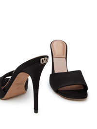 105mm Nite-Out satin sandals A gold-tone Vlogo plaque adorns the heel of these black mules, crafted from smooth suede in Italy. Sitting atop a towering stiletto heel, the pair are evocative of Valentino Garavani's heritage and use of iconic house motifs in its footwear collections. Highlights - Black - Calf leather - Silk blend - Open toe - Branded insole - Vlogo hardware at heel - High stiletto heel Made in Italy Composition Outer: Polyester 74%, Viscose 72%, Silk 28%, Elastodiene 26% Sole: Calf Leather 100% Lining: Lambskin 100% Washing instructions Read Manufacturer Guidelines