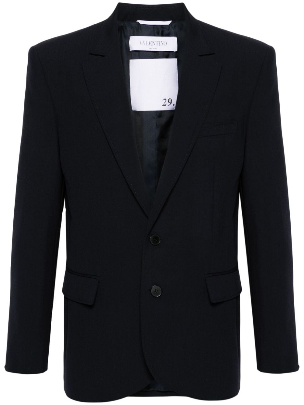 notched-lapels single-breasted blazer Highlights - Valentino ready to wear - Navy blue - Wool - Interlock twill weave - Notched lapels - Front button fastening - Shoulder pads - Long sleeves - Buttoned cuffs - Chest welt pocket - Two front flap pockets - American rear vent - Straight hem - Full lining Made in Italy Composition Lining: Polyester 100%, Cupro 100% Outer: Wool 100% SIZE & FIT Model measurements Height 6 ft 2 in(1.87 m) Bust/Chest 37 in(94 cm) Hips 33.85 in(86 cm) Waist 27.95 in(71 cm) FittingInformation Designed for a slim fit, offering a comfortable fit that sits just away from the body The internal shoulder pads offer a structured shape Made from a midweight non-stretch fabric This piece fits true to size – take your usual size