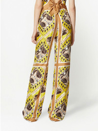 paisley-print logo branded silk trousers These silk trousers by Valentino Garavani boast a paisley print design in an earthy yellow and brown hue and are complete with logo branding throughout. Highlights - Valentino ready to wear - Mustard yellow - Paisley print - All-over logo print - Silk - High waist - Floor-length - The full look includes valentino garavani accessories. Made in Italy Composition Outer: Silk 100% Lining: Viscose 59%, Silk 41% Washing instructions Read Manufacturer Guidelines