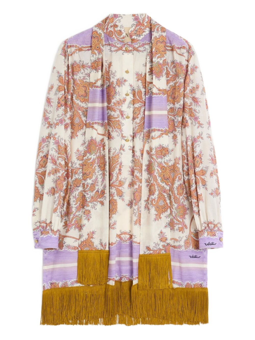 paisley-print mini dress Highlights - White - Short front button fastening - Scarf detailing - Long sleeves - Fringe detailing Made in Italy Composition Cotton 100% Washing instructions Read Manufacturer Guidelines