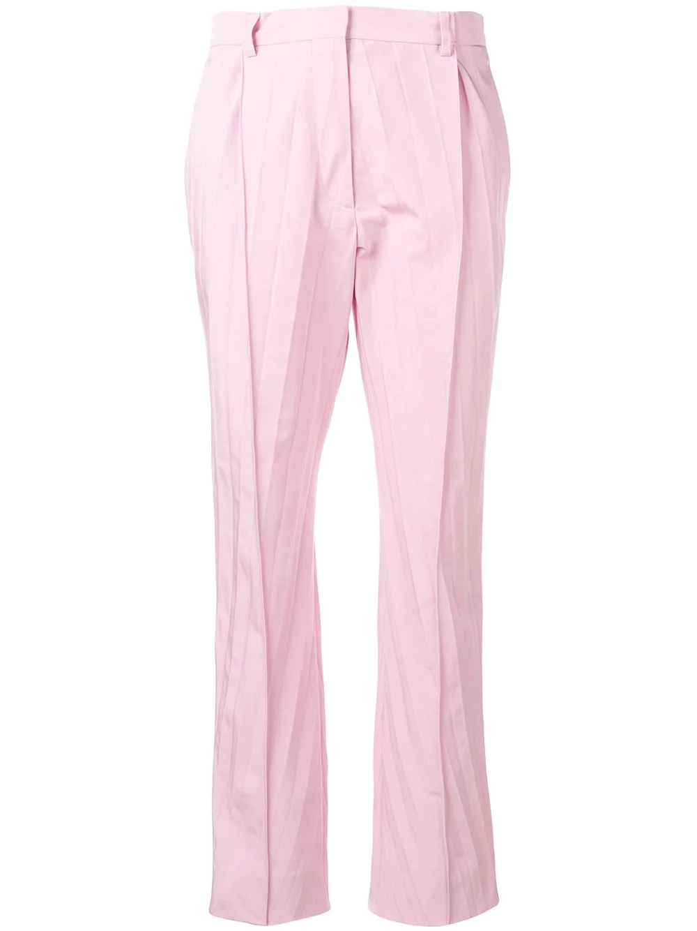 pleated cropped trousers Made from a crisp blend of cotton and silk, these trousers from Valentino Garavani are rendered in a light shade of pink. Sitting high at the waist for an elongating silhouette, the pair is cut to a tapered cropped leg. Highlights - Valentino ready to wear - Light pink - Cotton-silk blend - Tailored design - High-waisted - Concealed front fastening - Belt loops - Piped-trim detailing - Cropped Made in Italy Composition Lining: Viscose 63%, Silk 37% Outer: Cotton 54%, Polyester 46% SIZE & FIT Model measurements Height 5 ft 10 in(1.78 m) Bust/Chest 31.49 in(80 cm) Hips 35.43 in(90 cm) Waist 24.8 in(63 cm) Washing instructions Dry Clean Only