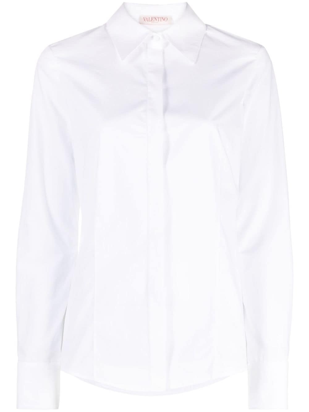 pointed-collar long-sleeve shirt Made in Italy from crisp white cotton, this shirt from Valentino Garavani taps into the house's penchant for timeless and understated styles. Highlights - Optical white - Cotton - Pointed flat collar - Long sleeves - Buttoned cuffs - Concealed front button fastening - Curved hem Made in Italy Composition Cotton 100% SIZE & FIT Model measurements Height 5 ft 10 in(1.78 m) Bust/Chest 33.07 in(84 cm) Hips 35.82 in(91 cm) Waist 25.98 in(66 cm) FittingInformation Designed for a slim fit that sits just away from the body offering a close yet comfortable fit The dart stitching adds structure and a closer fit in the torso of this piece Made from a midweight non-stretch fabric This piece fits true to size – take your usual size Washing instructions Dry Clean Only