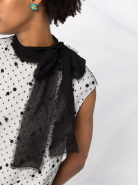 pussy-bow polka dot dress Valentino Garavani's pussy-bow polka dot dress embodies the brand's appreciation for refined glamour with its delicate netting covering the entire mini silhouette. Highlights - Valentino ready to wear - White/black - Cotton blend - Pussy-bow collar - Layered design - Pleated skirt - Rear button fastening - Sleeveless Made in Italy Composition Outer: Silk 100%, Virgin Wool 65%, Polyamide 62%, Cotton 35%, Viscose 35%, Polyester 3% Lining: Viscose 91%, Spandex/Elastane 9% SIZE & FIT Model measurements Height 5 ft 11 in(1.8 m) Bust/Chest 31.49 in(80 cm) Hips 35.82 in(91 cm) Waist 24.8 in(63 cm) FittingInformation This piece fits true to size. We recommend you get your regular size Cut for a loose fit Made with a mid-weight non-stretch fabric Washing instructions Read Manufacturer Guidelines