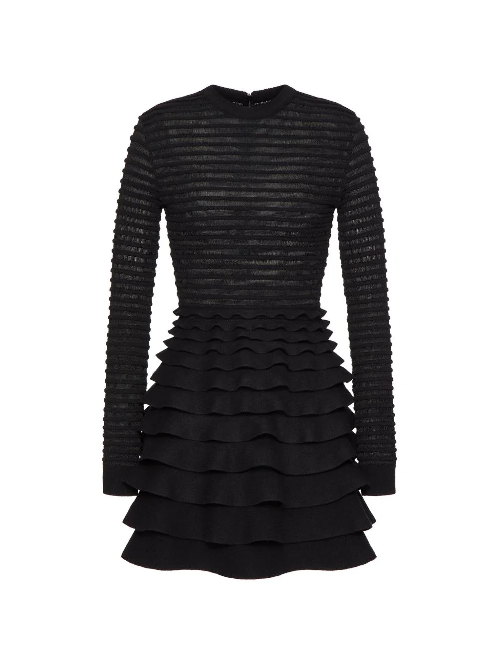 ribbed-tiered mini dress Highlights - Black - Ribbed detailing - Round neck - Long sleeves - Straight hem - Tiered skirt Made in Italy Composition Viscose 100%, Wool Blend 100% Washing instructions Read Manufacturer Guidelines