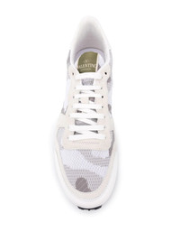 Camouflage Rockrunner sneakers In a playful iteration of the classic camo print, Valentino Garavani's Camouflage Rockrunners add colour and dimension to their AW21 footwear. Boasting leather panels and the house's signature Rockstuds at the sole, these low-top sneakers are finished with a patch at the tongue and a contrasting heel counter. Highlights - White - Calf leather - Mesh detailing - Suede trim - Camouflage pattern - Signature rockstud detailing - Logo patch at the tongue - Front lace-up fastening - Round toe - Ridged rubber sole Made in Italy Composition Outer: Calf Leather 100%, Polyester 100% Sole: Rubber 100% Lining: Polyester 100% SIZE & FIT Measurement HEEL 1.37 in(3.5 cm) Sole height 0.59 in(1.5 cm) Washing instructions Read Manufacturer Guidelines