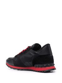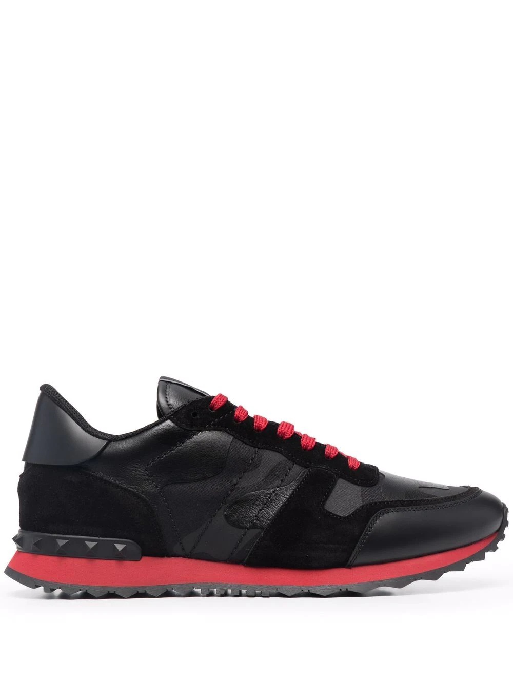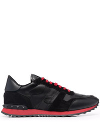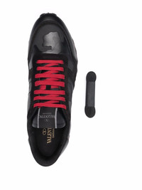 Camouflage Noir Rockrunner sneakers Crafted from sleek leather and adorned with a camouflage pattern these Rockrunner low-top sneakers from Valentino Garavani exude muted elegance. Crafted from cotton and lambskin, they are presented in a black and red colourway. Highlights - Black/red - Calf leather - Round toe - Camouflage pattern - Front lace-up fastening - Logo patch at the tongue - Ridged rubber sole Made in Italy Composition Outer: Calf Leather 100%, Calf Suede 100%, Lamb Skin 50%, Cotton 30%, Polyester 20% Lining: Polyester 100% Sole: Plastic 100% SIZE & FIT Measurement Sole height 0.78 in(2 cm) HEEL 1.18 in(3 cm) Washing instructions Read Manufacturer Guidelines