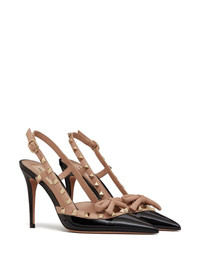Valentino Garavani Rockstud Bow patent leather slingback pumps Crafted from leather and sculpted to a point-toe silhouette, Valentino Garavani’s slingback pumps are traced with signature Rockstud detailing – a motif inspired by ‘bugnatos’, often seen on palazzo-style buildings in Rome. Highlights - Black/beige - Platinum-finish studs - Nappa leather bow detail - Nappa leather straps and trim - Adjustable buckle strap - Heel height 100mm/4 in. - Made in italy Made in Italy Composition Outer: Metal 100%, Lambskin 100%, Calf Leather 100% Sole: Calf Leather 100% Lining: Calf Leather 100%, Goat Skin 100% SIZE & FIT Measurement HEEL 3.93 in(10 cm) Washing instructions Read Manufacturer Guidelines