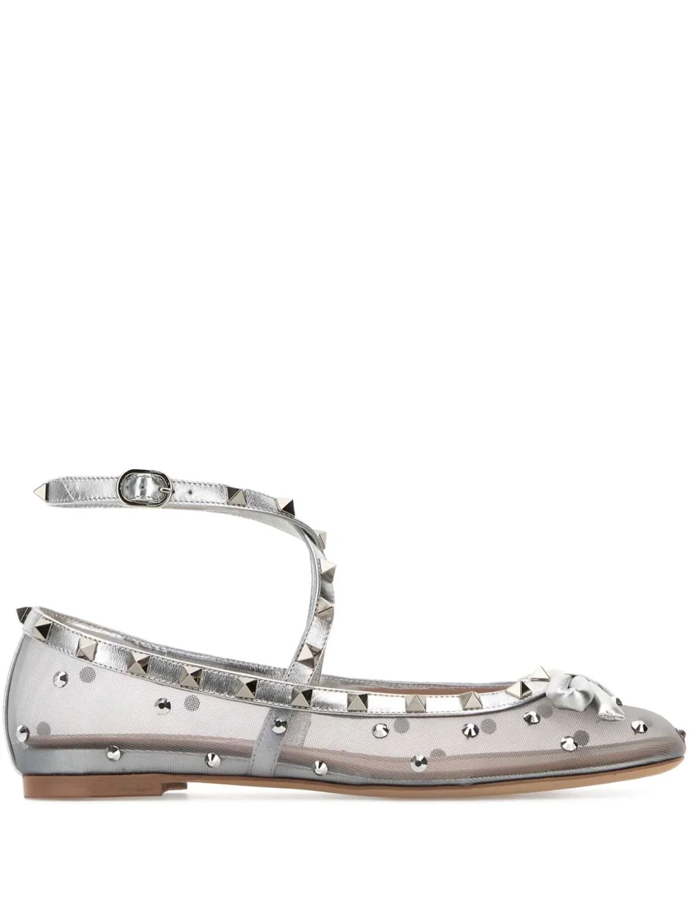 Rockstud mesh ballet flats Highlights - Grey - Calf leather - Transparent design - Silver-tone rockstud detailing - Bow detailing - Round toe - Buckle-fastening ankle strap - Branded insole - Flat sole Made in Italy Composition Lining: Sheepskin 100% Outer: Polyamide 100%, Sheepskin 100% Sole: Calf Leather 100%