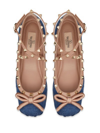 Rockstud denim ballerina shoes The crossover ankle straps and padded satin bows on these denim Valentino Garavani ballet flats are modelled after authentic pointe dancing designs. In a signature twist, the leather trims are traced in gold-tone Rockstuds – each one is hand-polished to maintain its shine. Highlights - Blue - Denim - Signature rockstud detailing - Crossover strap detail - Buckle-fastening ankle strap - Branded footbed - Bow detailing - Round toe - Leather sole Made in Italy Composition Lining: Lambskin 100%, Goat Skin 100% Outer: Metal 100%, Calf Leather 100%, Cotton 98%, Elastane 2% Sole: Calf Leather 100% Washing instructions Read Manufacturer Guidelines