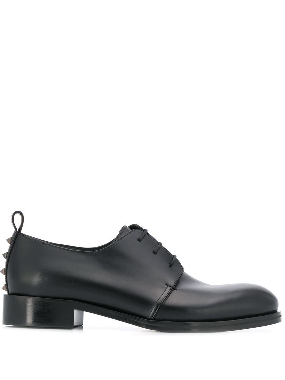 Rockstud Derby shoes There is dressy, and then there is Valentino Garavani sophistication. Sleek and elegant, these black leather Valentino Garavani Rockstud Derby shoes are the wardrobe staple you have been longing for. Get smart. Featuring a round toe, a lace fastening, a leather insole and a low block heel. Made in Italy Composition Outer: Calf Leather 100% Lining: Calf Leather 100% Sole: Calf Leather 100%, Rubber 100% SIZE & FIT Measurement HEEL 0.98 in(2.5 cm) Sole height 0.39 in(1 cm)