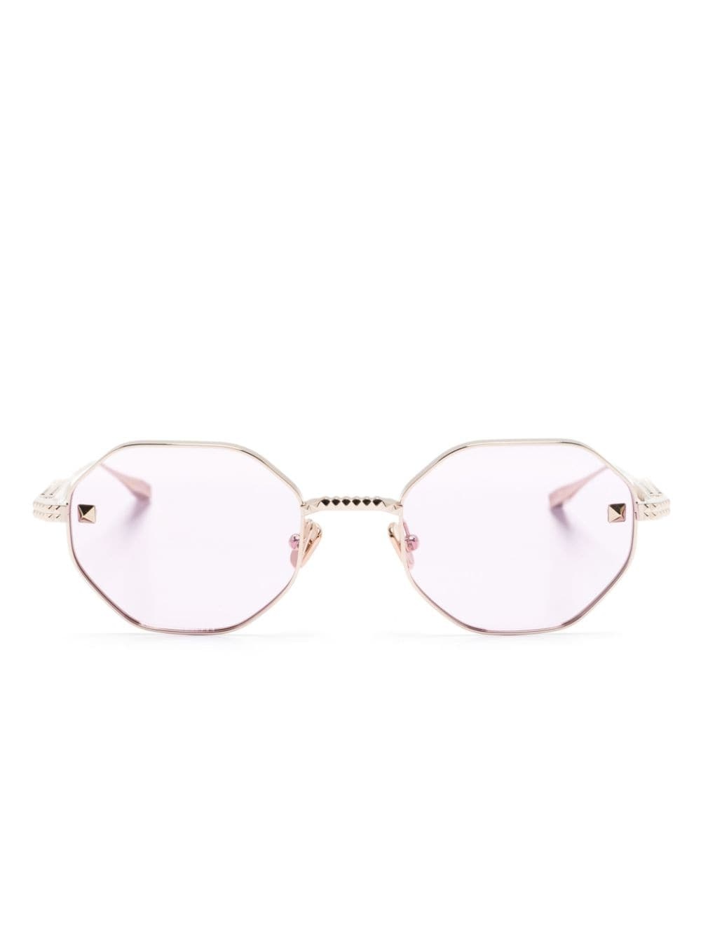 Rockstud geometric-frame sunglasses Sharp, geometric lines define these gold-tone Valentino Eyewear sunglasses. Made from titanium, they boast an octagonal frame anchored by arms embossed with the maison's signature Roman palazzo-inspired Rockstud detailing, lending tactility and a branded element. Highlights - Valentino ready to wear - Gold-tone - Titanium - Gold-tone rockstud detailing - Geometric frame - Purple tinted lenses - Nose pads - Straight arms - Curved tips - These glasses come with a protective case. Imported Composition Titanium 100% SIZE & FIT Measurement Arm Length 5.51 in(14 cm) Bridge Width 0.82 in(2.1 cm) Lens Diameter 2.04 in(5.2 cm) Total Width 5.51 in(14 cm)