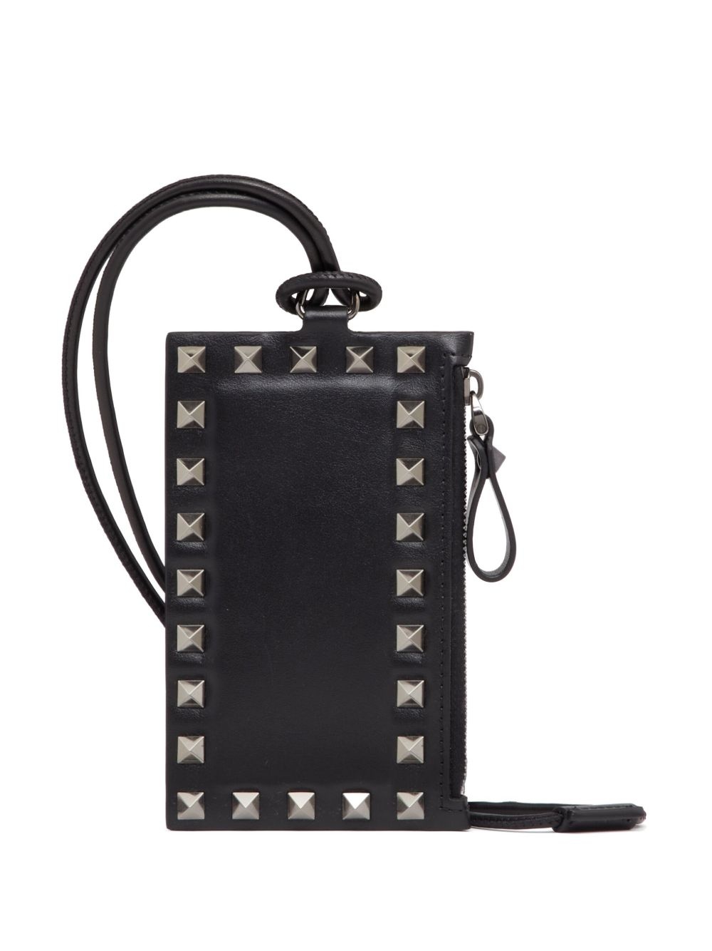 Rockstud leather cardholder Highlights - Black - Calf leather - Smooth grain - Signature rockstud embellishment - Wrist strap - Zip-fastening compartment - Debossed logo to the rear - Rear card slots Made in Italy Composition Outer: Calf Leather 100% Ruthenium Plated Metal 100% SIZE & FIT Measurement DEPTH 0.39 in(1 cm) LENGTH 5.51 in(14 cm) WIDTH 3.54 in(9 cm)