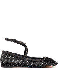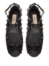 Rockstud mesh ballet flats Valentino Garavani's Rockstud embellishments were first designed in 2010 and have since become an iconic signifier of the Italian brand. Here, they decorate the silhouette of these mesh ballerina shoes that are enhanced with rhinestone detailing throughout. Highlights - Black - Calf leather - Mesh panelling - Signature rockstud detailing - Buckle-fastening ankle strap - Branded footbed - Bow detailing - Round toe - Leather sole Made in Italy Composition Outer: Metal 100%, Polyamide 100%, Calf Leather 100% Lining: Lambskin 100% Sole: Calf Leather 100%