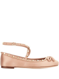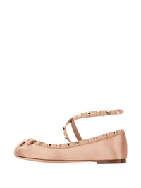 Rockstud satin ballet flats Valentino Garavani's Rockstud embellishments were first designed in 2010 and have since become an iconic signifier of the Italian brand. Here, they decorate the silhouette of these rose-pink ballerina shoes that are enveloped in lustrous satin. Highlights - Rose pink - Calf leather - Satin finish - Gold-tone rockstud embellishment - Bow detailing - Buckle-fastening crossover ankle strap - Branded footbed - Round toe - Flat sole Made in Italy Composition Outer: Metal 100%, Lambskin 100%, Viscose 72%, Silk 28% Lining: Lambskin 100%, Goat Skin 100% Sole: Calf Leather 100% SIZE & FIT Measurement HEEL 0.39 in(1 cm)