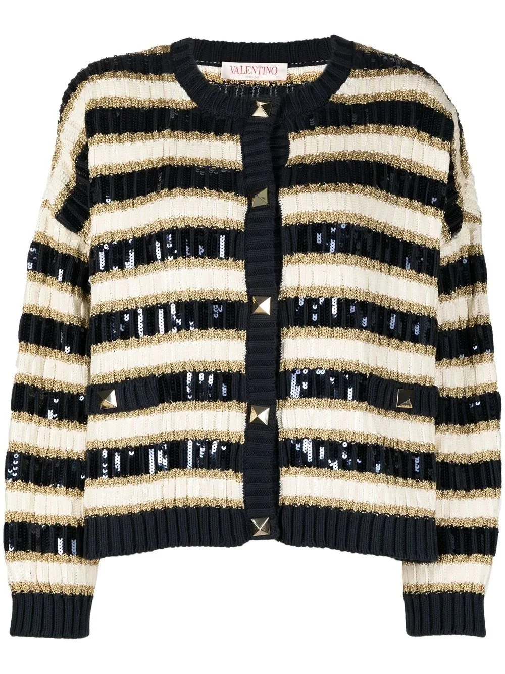Rockstud sequinned cardigan Valentino Garavani elevates this classic knitted cardigan with a shimmering completion, by adding gold-tone Rockstuds and tonal sequins throughout. Highlights - Valentino ready to wear - Navy blue/cream/gold-tone - Cotton blend - Metallic threading - Sequin embellishment - Signature rockstud detailing - Horizontal stripe pattern - Knitted construction - Crew neck - Front button fastening - Long sleeves - Elasticated cuffs Made in Italy Composition Polyester 100%, Cotton 67%, Viscose 15%, Metallic Fibre 9%, Polyamide 9% SIZE & FIT Model measurements Height 5 ft 9 in(1.75 m) Bust/Chest 32.67 in(83 cm) Hips 36.22 in(92 cm) Waist 24.8 in(63 cm) FittingInformation This piece fits true to size. We recommend you get your regular size Cut for a loose fit Made with a mid-weight fabric Washing instructions Read Manufacturer Guidelines