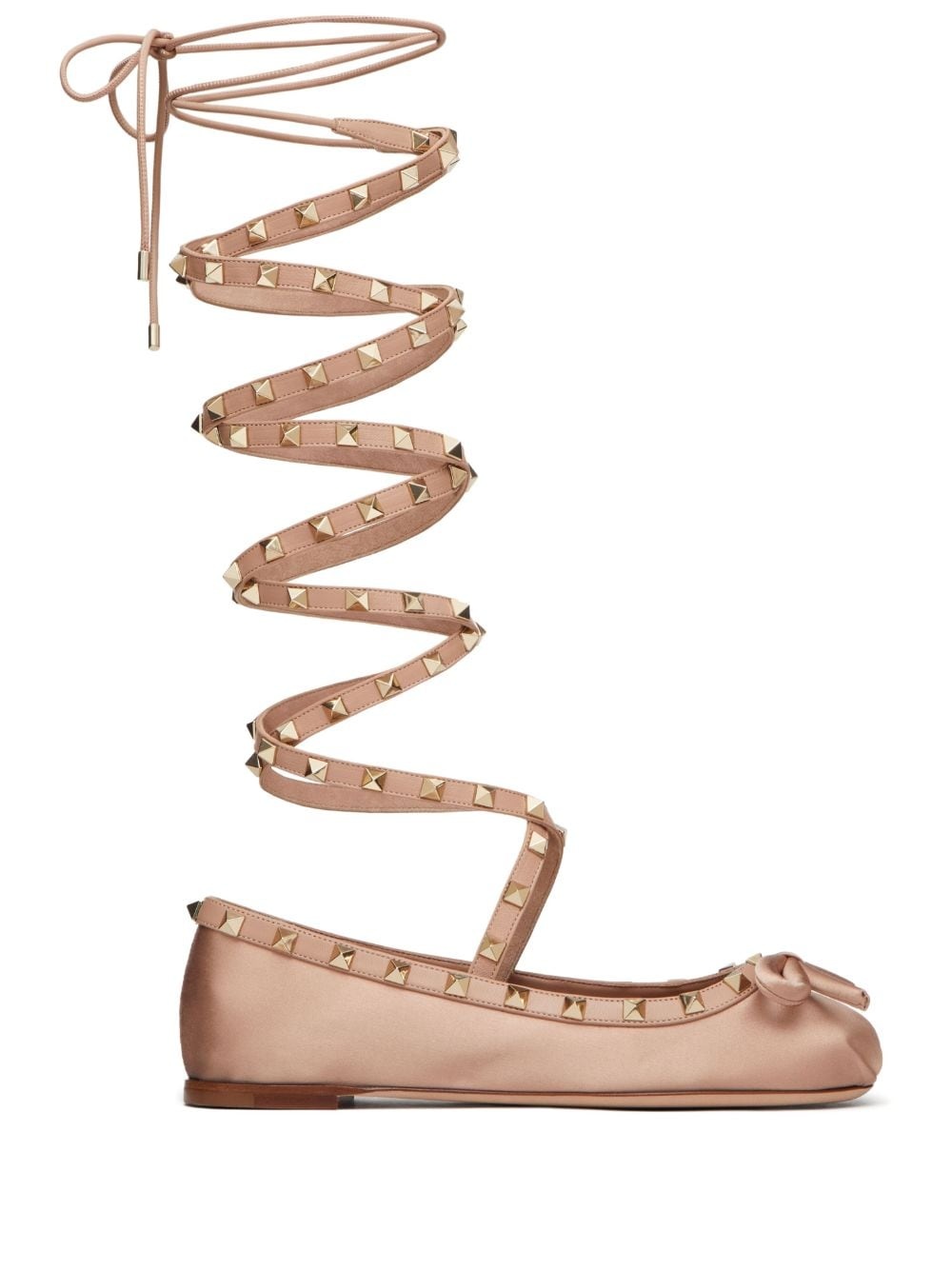 Rockstud satin ballerina shoes The Rockstud ballerina shoes by Valentino Garavani arrive in a strappy iteration. Adorned with the Maison's iconic gold-tone hardware, leather straps criss-cross along the calf, tied at the top. Crafted from patent calf leather in Italy, they boast a contrasting bow at the toe. Highlights - Blush pink - Calf leather - Satin finish - Gold-tone rockstud embellishment - Multi-way straps - Tie-fastening straps - Bow detailing - Branded footbed Made in Italy Composition Sole: Calf Leather 100% Outer: Lamb Skin 100%, Metal 100%, Viscose 72%, Silk 28% Lining: Goat Skin 100%, Lamb Skin 100%, Polyester 68%, Polyurethane 32% Washing instructions Read Manufacturer Guidelines
