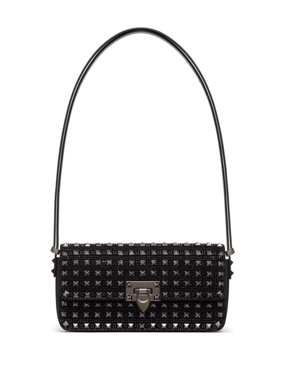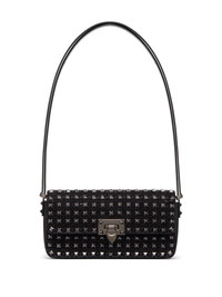 Rockstud23 E/W embroidered shoulder bag Dimension and texture stand out as key features of this black Rockstud23 shoulder bag by Valentino Garavani. Crafted from leather to an elongated East-West silhouette held on an adjustable strap, it is encrusted with scores of tonal rhinestones and the house's signature Rockstud embellishment for a luminous and tactile finish. Highlights - Black tie collection - Black - Calf leather - Signature rockstud detailing - Rhinestone embellishment - Foldover top - Hook fastening - Adjustable shoulder strap - Main compartment - Internal slip pocket Made in Italy Composition Lining: Lamb Skin 100%, Calf Leather 100% Outer: glass 100%, Calf Leather 100%, Metal 100%, Lamb Skin 100%, Zamak 100%, Crystal 100% SIZE & FIT Measurement DEPTH 2.36 in(6 cm) HEIGHT 5.51 in(14 cm) WIDTH 9.84 in(25 cm) Washing instructions Read Manufacturer Guidelines