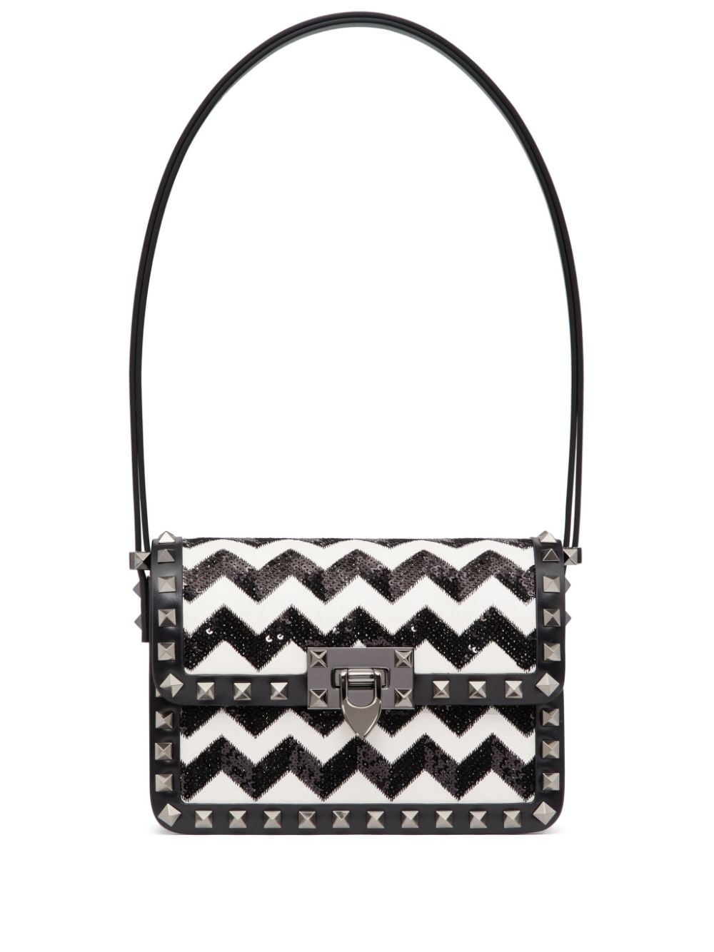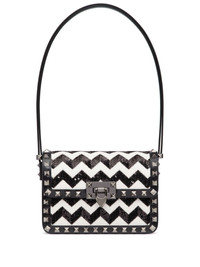 small Rockstud23 embroidered shoulder bag Highlights - Black tie collection - Black/white - Calf leather - Signature rockstud embellishment - Sequin embellishment - Zigzag print - Adjustable shoulder strap - Internal slip pocket - Foldover top - Main compartment Made in Italy Composition Outer: Calf Leather 100%, Polyester 100%, Zamak 100%, Metal 100% Lining: Lamb Skin 100% SIZE & FIT Measurement DEPTH 3.14 in(8 cm) HEIGHT 4.72 in(12 cm) WIDTH 7.28 in(18.5 cm) Washing instructions Read Manufacturer Guidelines