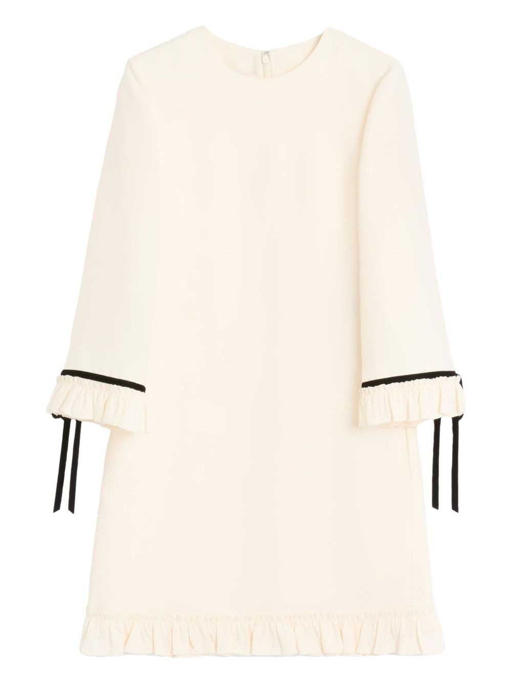Crepe Couture mini dress Highlights - Ivory - Virgin wool-silk blend - Rear zip fastening - Crew neck - Ruffle collar - Long sleeves - Ruffle cuffs - Contrasting laces - Ruffle hem - Thigh-length Made in Italy Composition Outer: Polyamide 100%, Virgin Wool 65%, Silk 35% Lining: Silk 100%