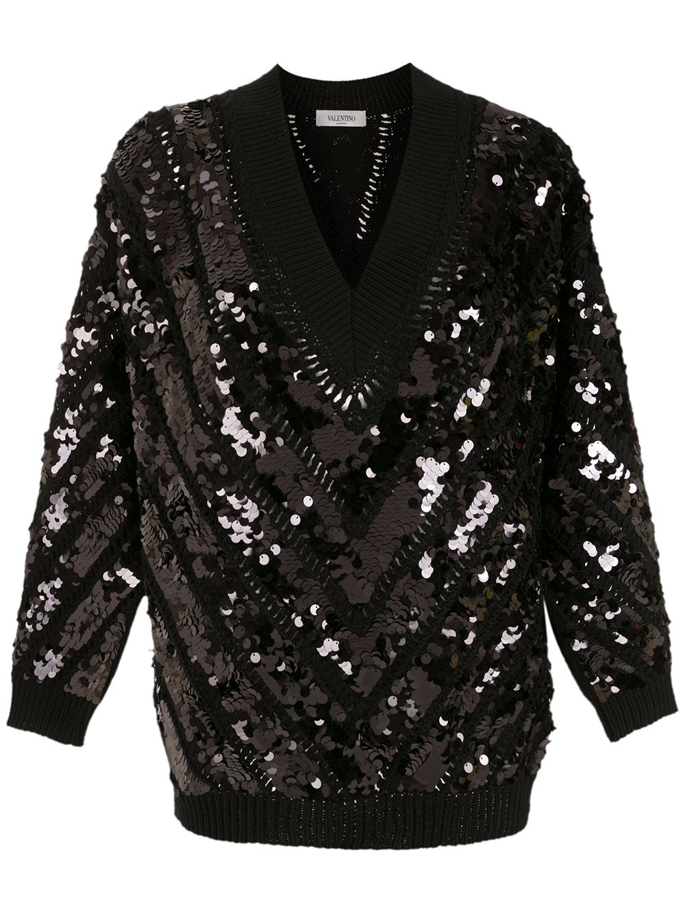 sequin-embellished V-neck jumper Valentino Garavani balances innovation with tradition, in its use of creative designs and classic Italian construction. Showcased on this jumper with a V-neck and long-sleeve silhouette, sequin embellishment adds a signaturely glamorous edge to the garment. Highlights - Valentino ready to wear - Black - Virgin wool - Sequin embellishment - V-neck - Ribbed detailing - Long sleeves - Straight hem Made in Italy Composition Virgin Wool 100%, Polyester 100% SIZE & FIT Model measurements Height 5 ft 10 in(1.77 m) Bust/Chest 31.1 in(79 cm) Hips 37 in(94 cm) Waist 25.98 in(66 cm) Measurement BUST 51.18 in(130 cm) LENGTH 30.7 in(78 cm) SLEEVE LENGTH 32.28 in(82 cm) WAIST 50.39 in(128 cm)