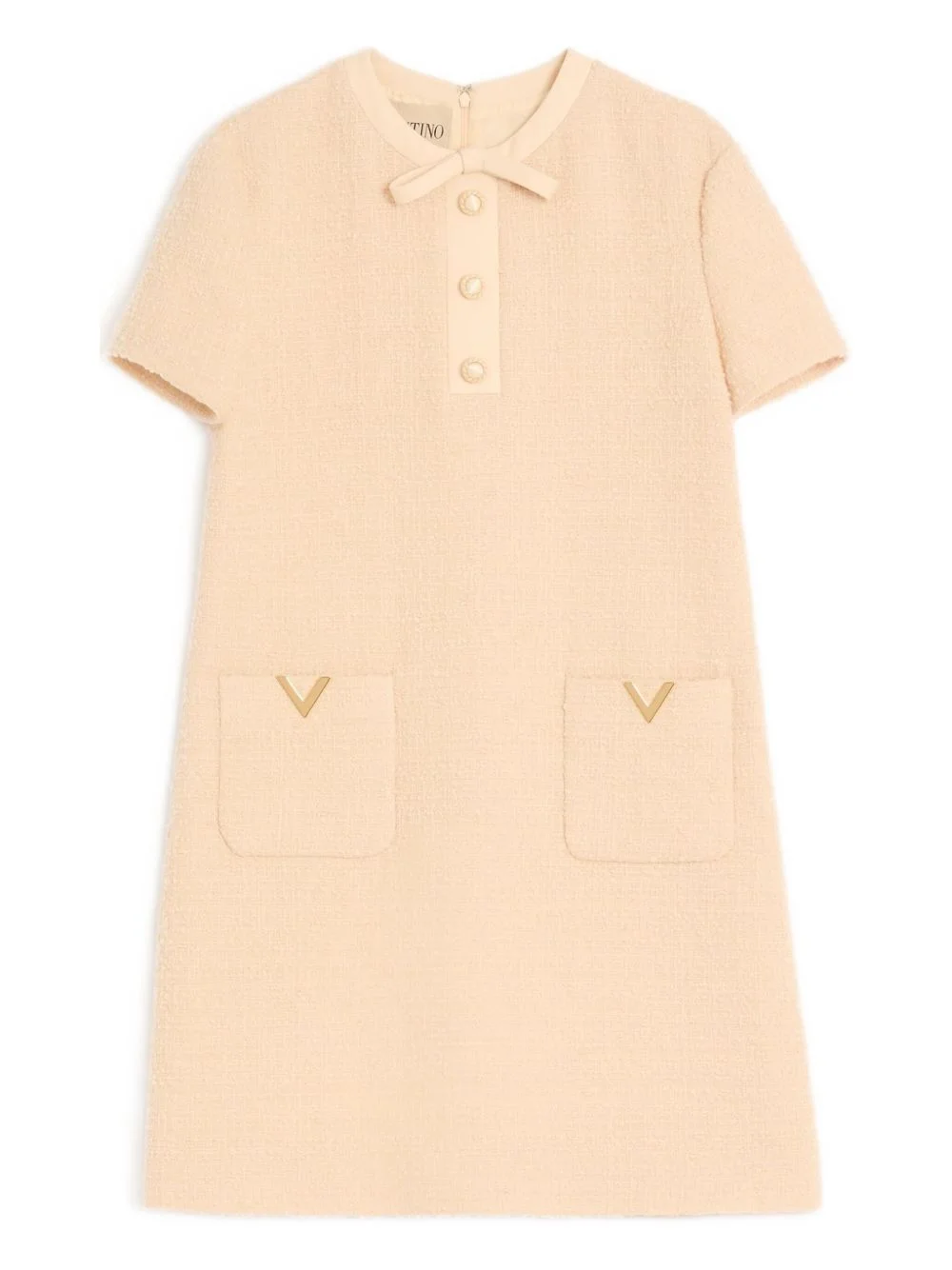 short dress in curly wool Highlights - Valentino dress - Light yellow - Crepe couture trim and bow - Velvet button detailing - Rear zipper - Hook-and-eye closure - Front pockets - Gold-tone logo detailing - The full look includes valentino garavani accessories. Made in Italy Composition Virgin Wool 95%, Polyamide 5%