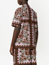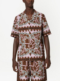 short-sleeve cotton shirt Encapsulating Valentino Garavani's bold and lively aesthetic, this short-sleeve shirt boasts an all-over abstract design that is complemented by logo lettering throughout. Highlights - Valentino ready to wear - Rust brown - Cotton - Abstract pattern print - All-over logo print - Notched collar - Front button fastening - Short sleeves - Straight hem - The full look includes valentino garavani accessories. Made in Italy Composition Cotton 100% SIZE & FIT Measurement CHEST 43.3 in(110 cm) Washing instructions Read Manufacturer Guidelines