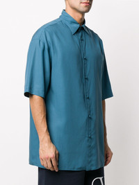 short-sleeved oversized shirt You always liked to boast about having nerves of steel. And now, you can boast about having this steel-blue short-sleeved oversized shirt from Valentino too. They'll be so intimidated! Featuring a pointed collar, a front button fastening, short sleeves, a curved hem and an oversized fit. POSITIVELY CONSCIOUS: At least 50% of the main material of this product meets our conscious criteria: for example, it's either organic, recycled, upcycled, or independently recognised as being better for the environment (such as linen, ramie, Tencel, etc.). Made in Italy Composition Lyocell 100% SIZE & FIT Model measurements Height 6 ft 1 in(1.85 m) Bust/Chest 37.79 in(96 cm) Hips 37.4 in(95 cm) Waist 30.7 in(78 cm) FittingInformation This piece fits true to size. We recommend you get your regular size Cut for a loose fit Made with a mid-weight non-stretch fabric