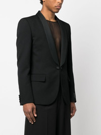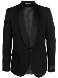 single-breasted blazer Showing the brand's glamourous approach this single-breasted blazer from Valentino Garavani is enhanced with shawl lapels. Its design features a classic straight cut made of virgin wool. Highlights - Valentino ready to wear - Black - Virgin wool - Shawl lapels - Front button fastening - Jetted chest pocket - Two side flap pockets - Long sleeves - Straight hem Made in Italy Composition Lining: Cupro 100% Outer: Virgin Wool 100% SIZE & FIT Model measurements Height 6 ft 1 in(1.85 m) Bust/Chest 38.58 in(98 cm) Hips 37 in(94 cm) Waist 30.31 in(77 cm) FittingInformation Designed for a slim fit, offering a comfortable fit that sits just away from the body Made from a midweight non-stretch fabric This piece fits true to size – take your usual size Measurement CHEST 44.88 in(114 cm) SLEEVE LENGTH 27.16 in(69 cm) LENGTH 30.7 in(78 cm) WAIST 41.73 in(106 cm)