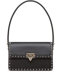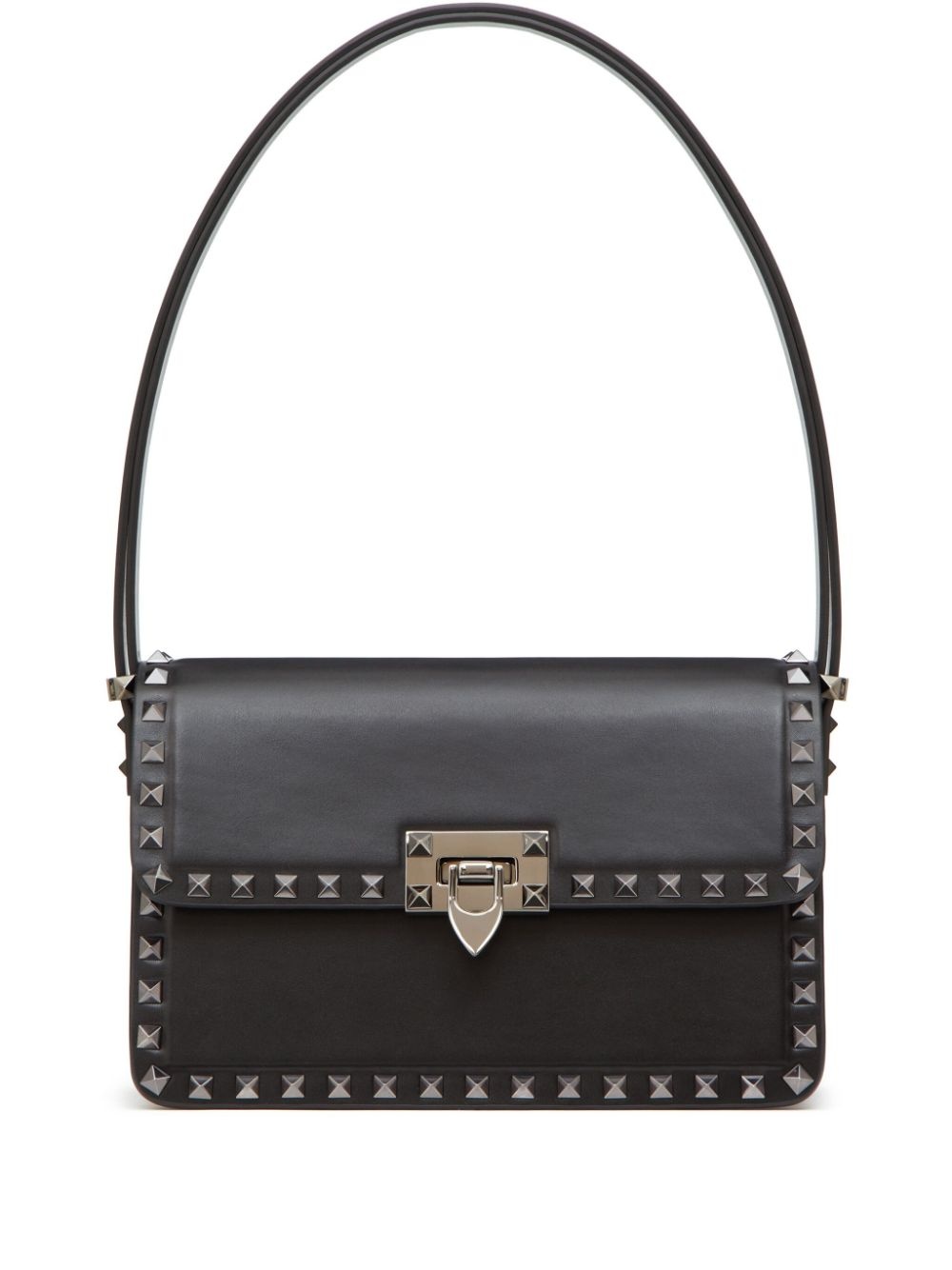 Rockstud23 leather shoulder bag Ruthenium-finish Rockstuds and a slender strap lend a punk-inspired edge to this shoulder bag from Valentino Garavani, exemplifying the label's blend of Italian elegance and contemporary detailing. Highlights - Black - Calf leather - Silver-tone rockstud detailing - Ruthenium-finish studs and hardware - Single shoulder strap - Foldover top - Hook fastening - Main compartment - Internal slip pocket - Leather lining Made in Italy Composition Outer: Calf Leather 100%, Metal 100% Lining: Lambskin 100% SIZE & FIT Measurement WIDTH 9.05 in(23 cm) HEIGHT 5.11 in(13 cm) DEPTH 3.54 in(9 cm) Washing instructions Read Manufacturer Guidelines