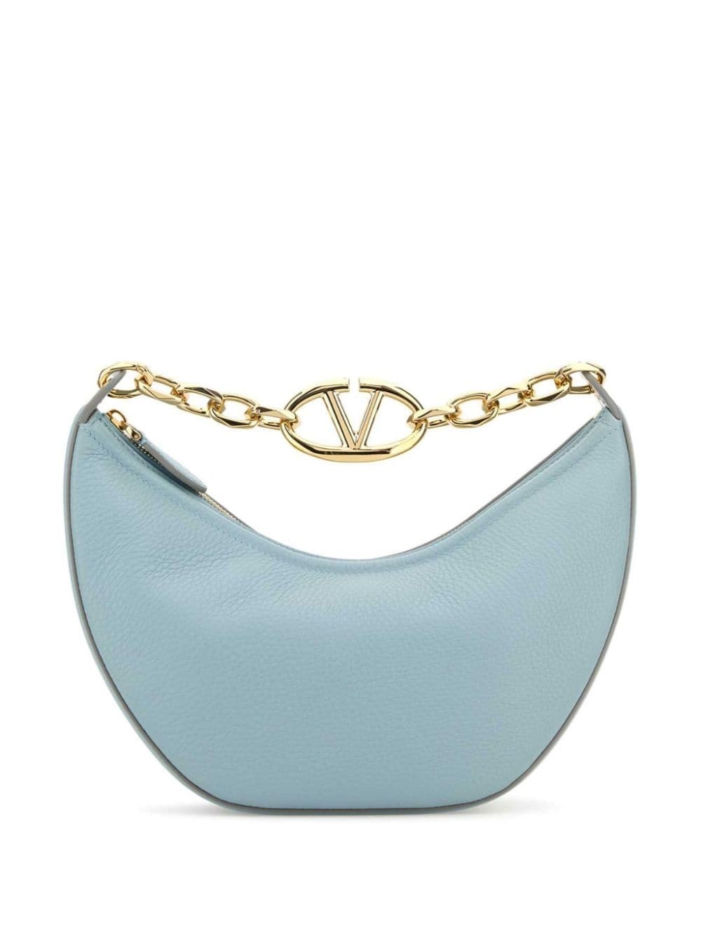 small Vlogo Moon tote bag Highlights - Cornflower blue - Calf leather - Grained texture - Top zip fastening - Single chain-link top handle - Adjustable detachable shoulder strap - Vlogo signature - Debossed logo to the front - Main compartment - Internal card slot - Debossed internal logo - Leather lining - This leather product is covered with a metallic foil that may make it sensitive to scratches and is likely to age over time. as such, it should be stored in a dustbag and cleaned with a soft, dry cloth. avoid contact with abrasive parts like zips, studs, strass and sequins. Made in Italy Composition Outer: Calf Leather 100%, Metal 100%, Lambskin 100% SIZE & FIT Measurement DEPTH 4.72 in(12 cm) HEIGHT 6.29 in(16 cm) WIDTH 11.81 in(30 cm) HANDLE 3.93 in(10 cm) STRAP 38.58 in(98 cm)